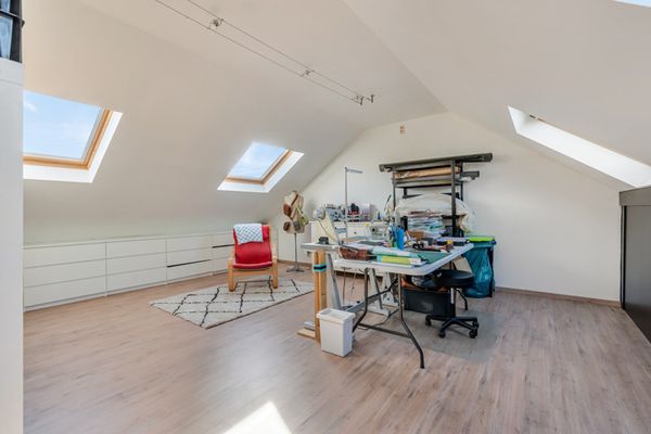 Zolderverdieping: deze is te bereiken via een vaste trap en is een volledig afgewerkte ruimte met voldoende daglicht. Momenteel wordt ze gebruikt als hobbyruimte, maar kan zeker ook dienst doen als (2) extra slaapkamer(s).